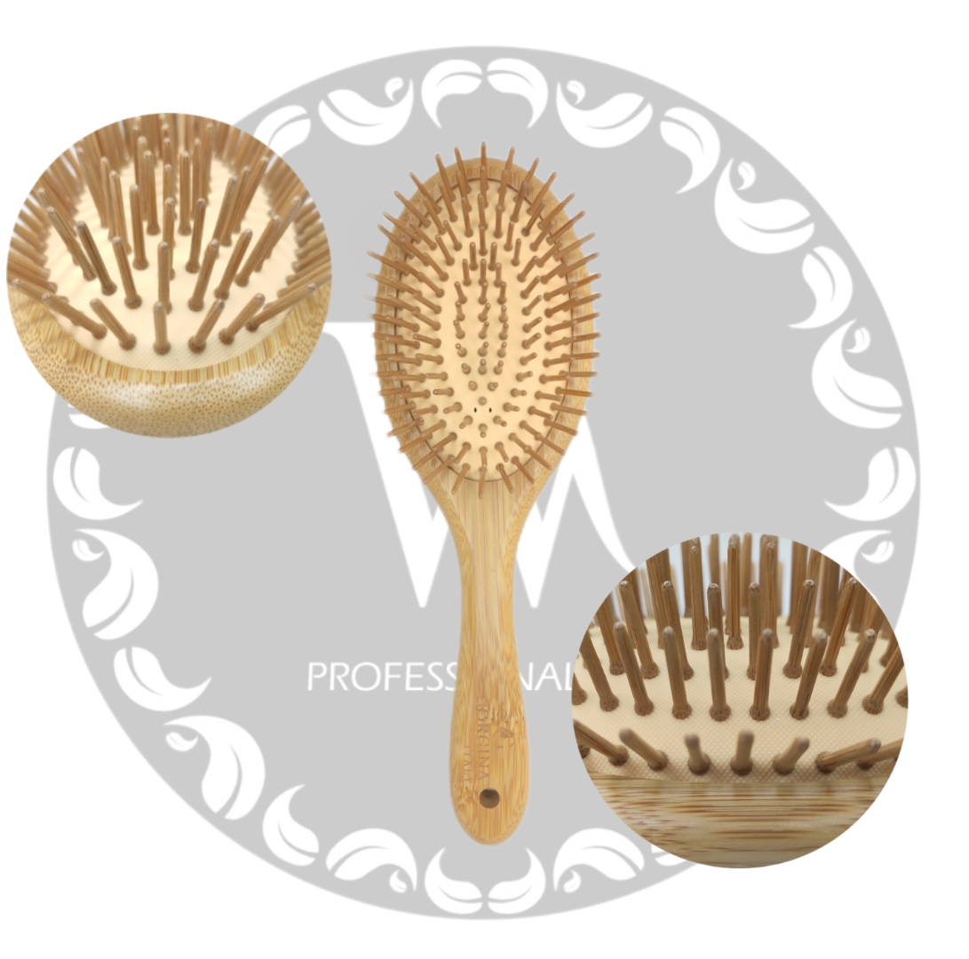 برس بامبو سرصاف سایز بزرگ مخصوص موهای بلند پرپشت یا کوتاه با کف بسیار نرم که باعث کشیدگی مو نمیشود دندانه و بدنه برس چوب بامبو اصلی میباشد